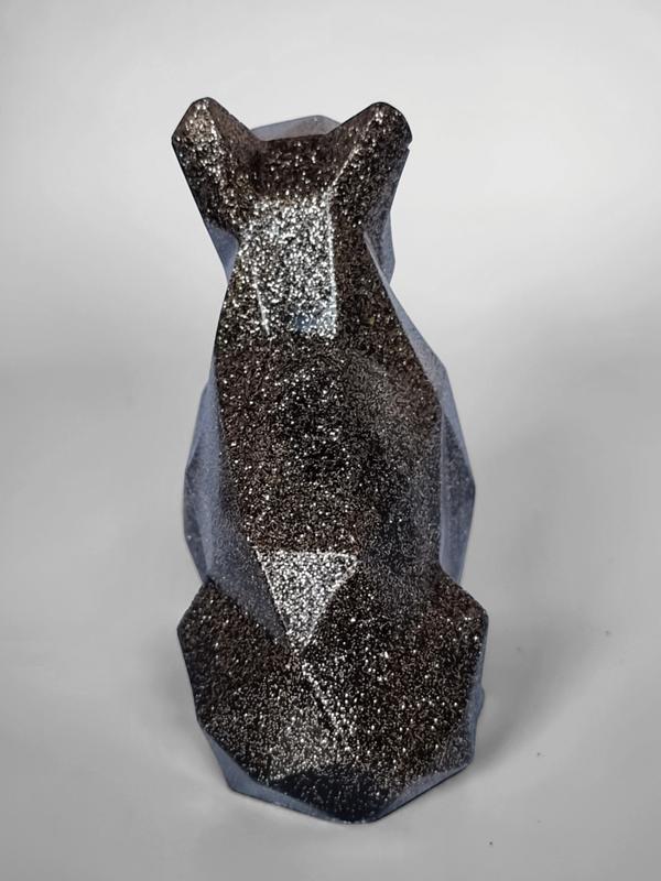Deze Franse bulldog is geometrisch van vorm en brons holografisch van kleur.