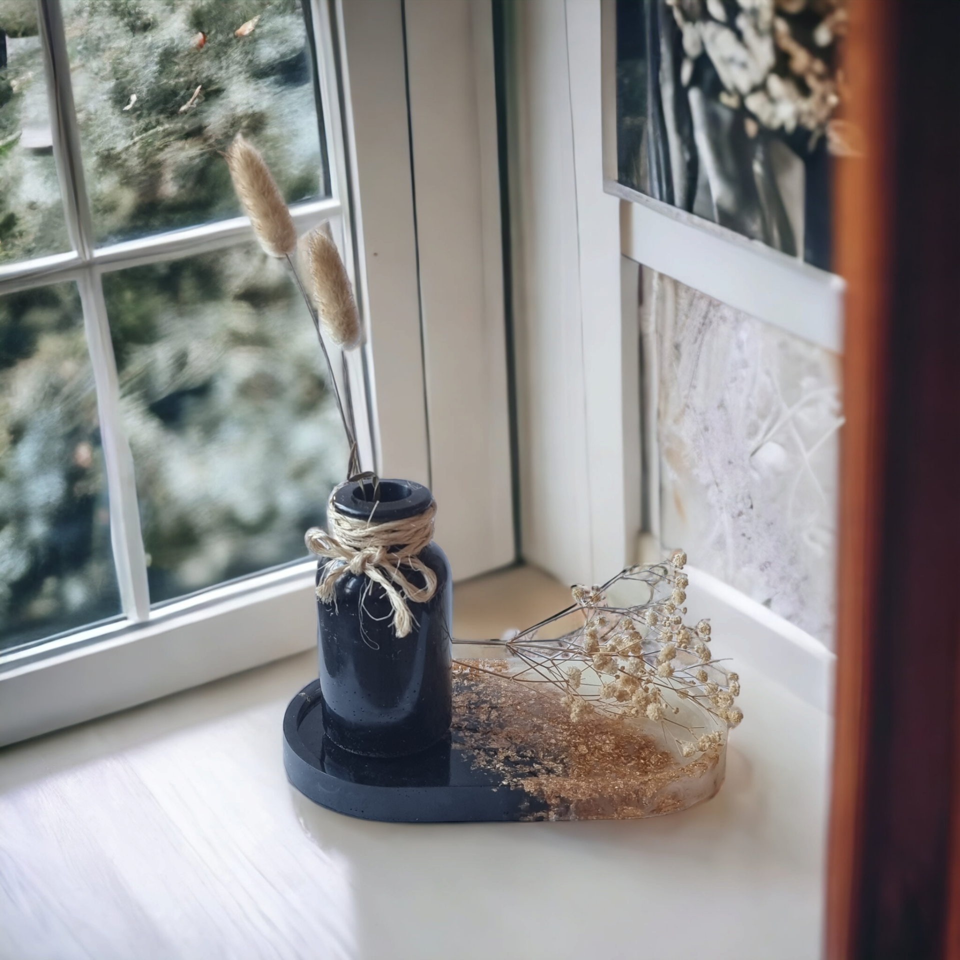 Hoe leuk is deze set! Een ovale onderzetter met vaasje. De foto is een voorbeeld. U kunt bij de bestelling zelf aangeven welke kleurencombinatie u wenst en eventuele toevoegingen, dan wordt deze set speciaal voor u gemaakt.