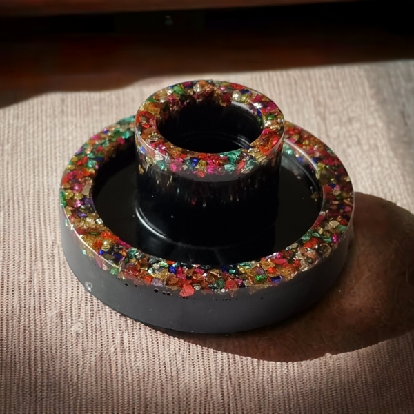 Kleur: zwart met stukjes gekleurd glas op de randen