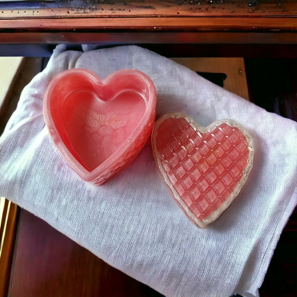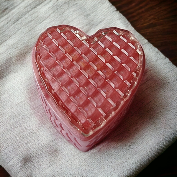 Dit doosje in hartjesvorm met ruitjes is roze van kleur en er zijn glitters toegevoegd. Het randje van de deksel is transparant.