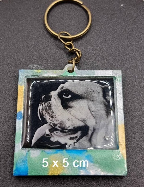 Vierkante sleutelhanger met foto. Deze sleutelhanger is een voorbeeld en gemaakt naar eigen inzicht. Het is mogelijk om uw sleutelhanger zelf samen te stellen met een eigen kleur ondergrond en eigen foto.